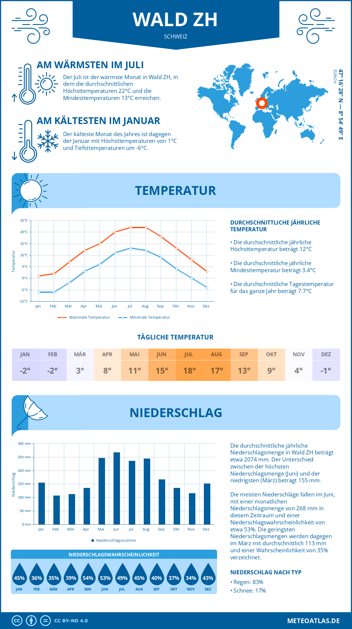 Der wärmste Zeitraum in Wald ZH umfasst unter anderem den Juli, mit durchschnittlichen Tagestemperaturen von 22°C und Nachttemperaturen von 13°C. Im Gegensatz dazu gehört der Januar und Februar zum kältesten Zeitraum des Jahres, mit Tagestemperaturen von 2°C und Nachttemperaturen um -6°C.