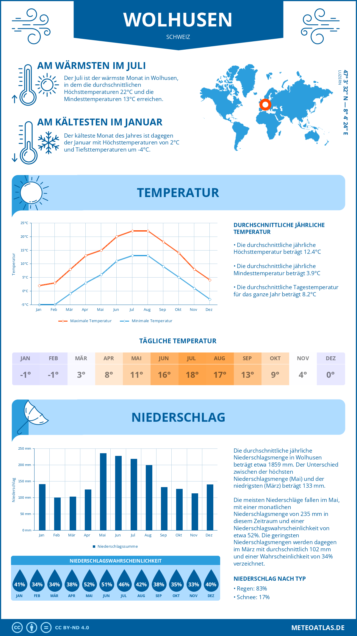 Infografik: Klima sowie monatliche Durchschnittstemperaturen und Niederschläge