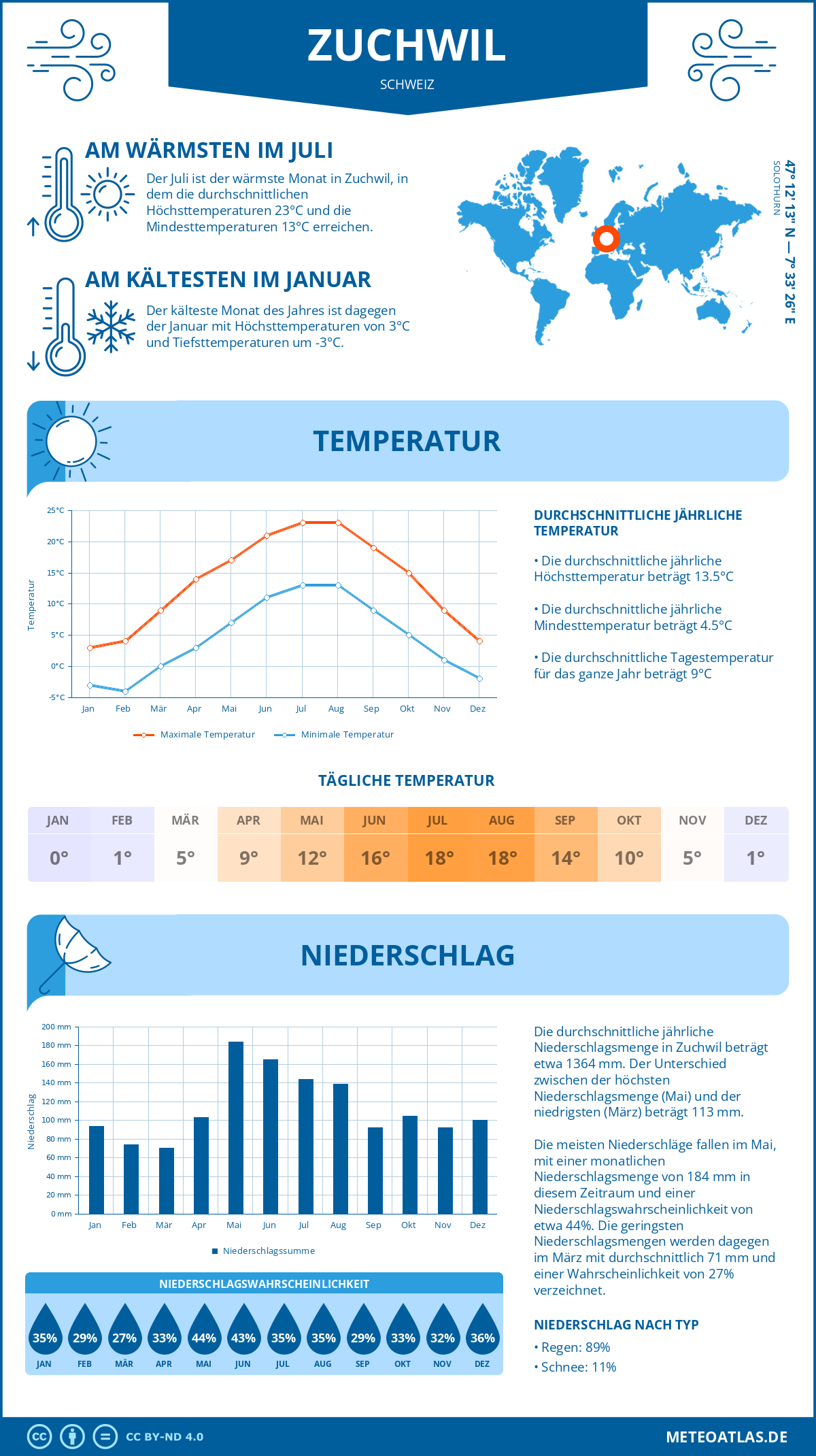 Zuchwil weist eine durchschnittliche Tagestemperatur von 14°C im Jahresmittel auf, während die nächtliche Temperatur auf etwa 5°C. Die durchschnittliche Temperatur über den gesamten Tagesverlauf beträgt 9°C.