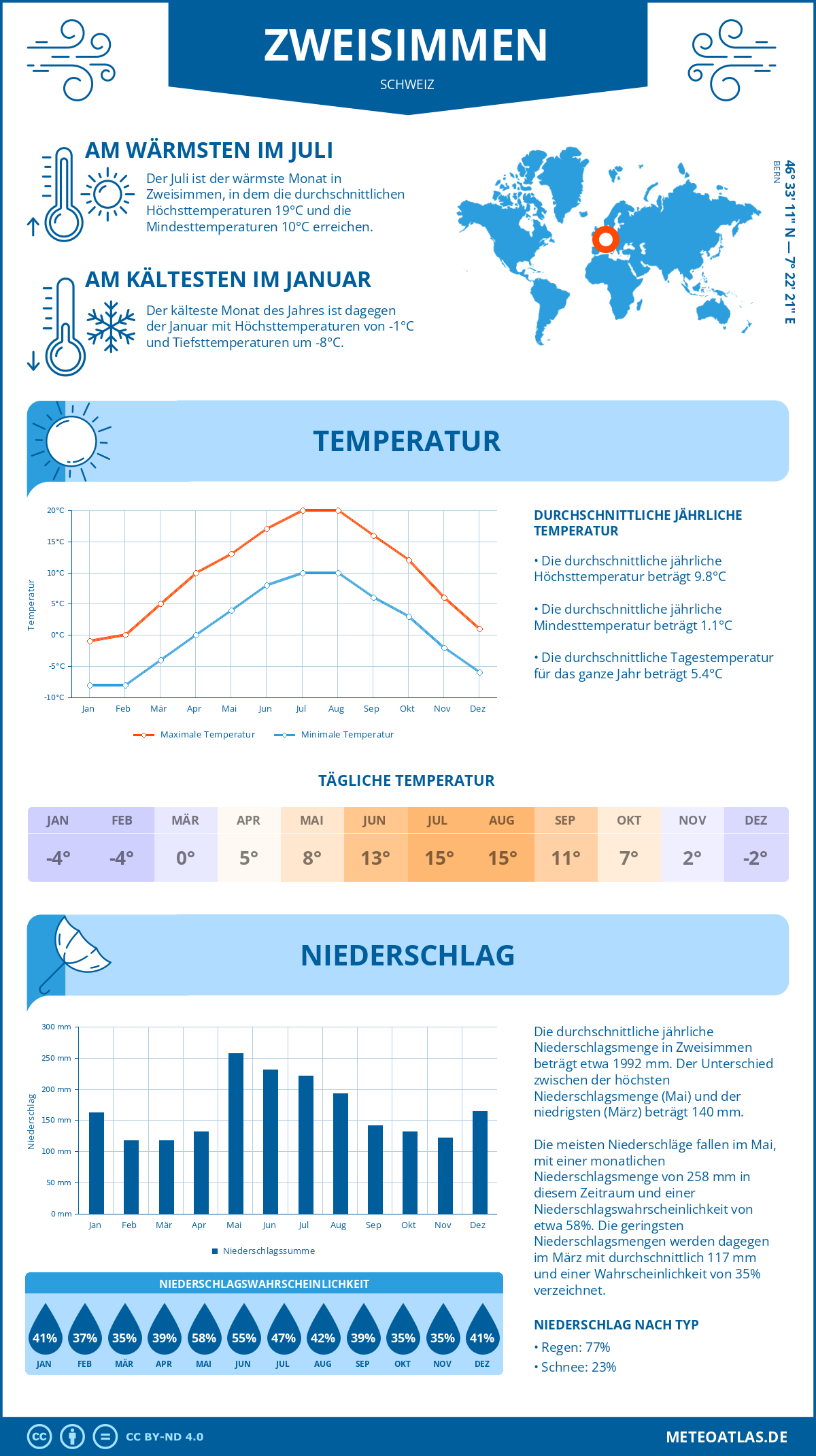 Zweisimmen weist eine durchschnittliche Tagestemperatur von 10°C im Jahresmittel auf, während die nächtliche Temperatur auf etwa 1°C. Die durchschnittliche Temperatur über den gesamten Tagesverlauf beträgt 5°C.