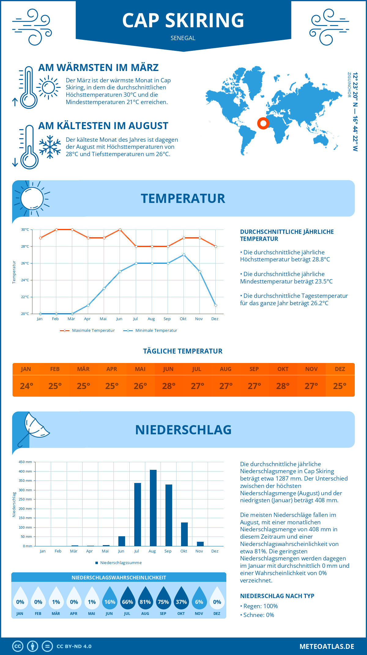 Cap Skiring weist eine durchschnittliche Tagestemperatur von 29°C im Jahresmittel auf, während die nächtliche Temperatur auf etwa 23°C. Die durchschnittliche Temperatur über den gesamten Tagesverlauf beträgt 26°C.