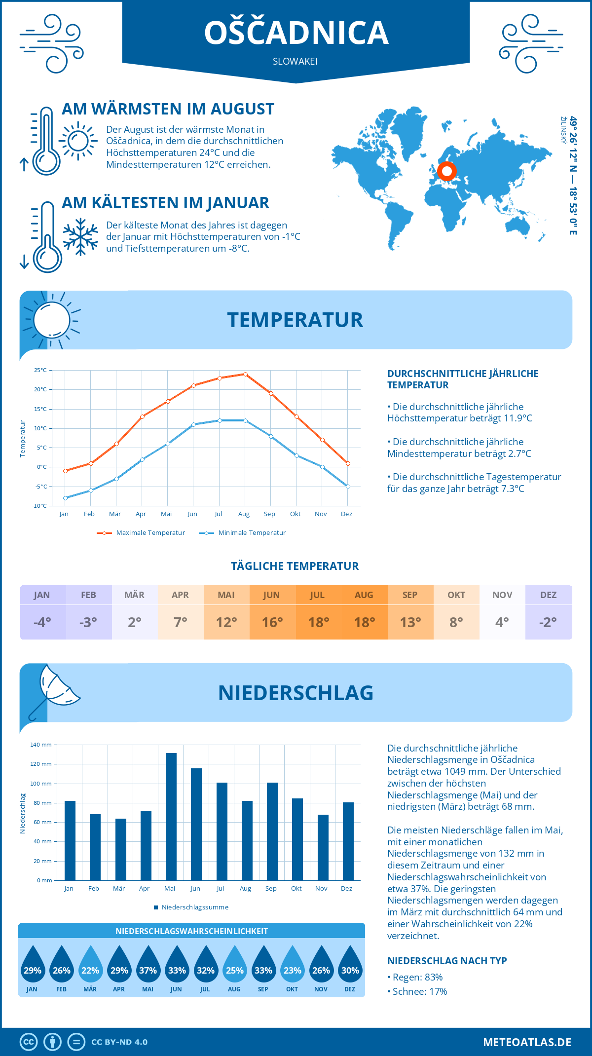 Oščadnica weist eine durchschnittliche Tagestemperatur von 12°C im Jahresmittel auf, während die nächtliche Temperatur auf etwa 3°C. Die durchschnittliche Temperatur über den gesamten Tagesverlauf beträgt 7°C.