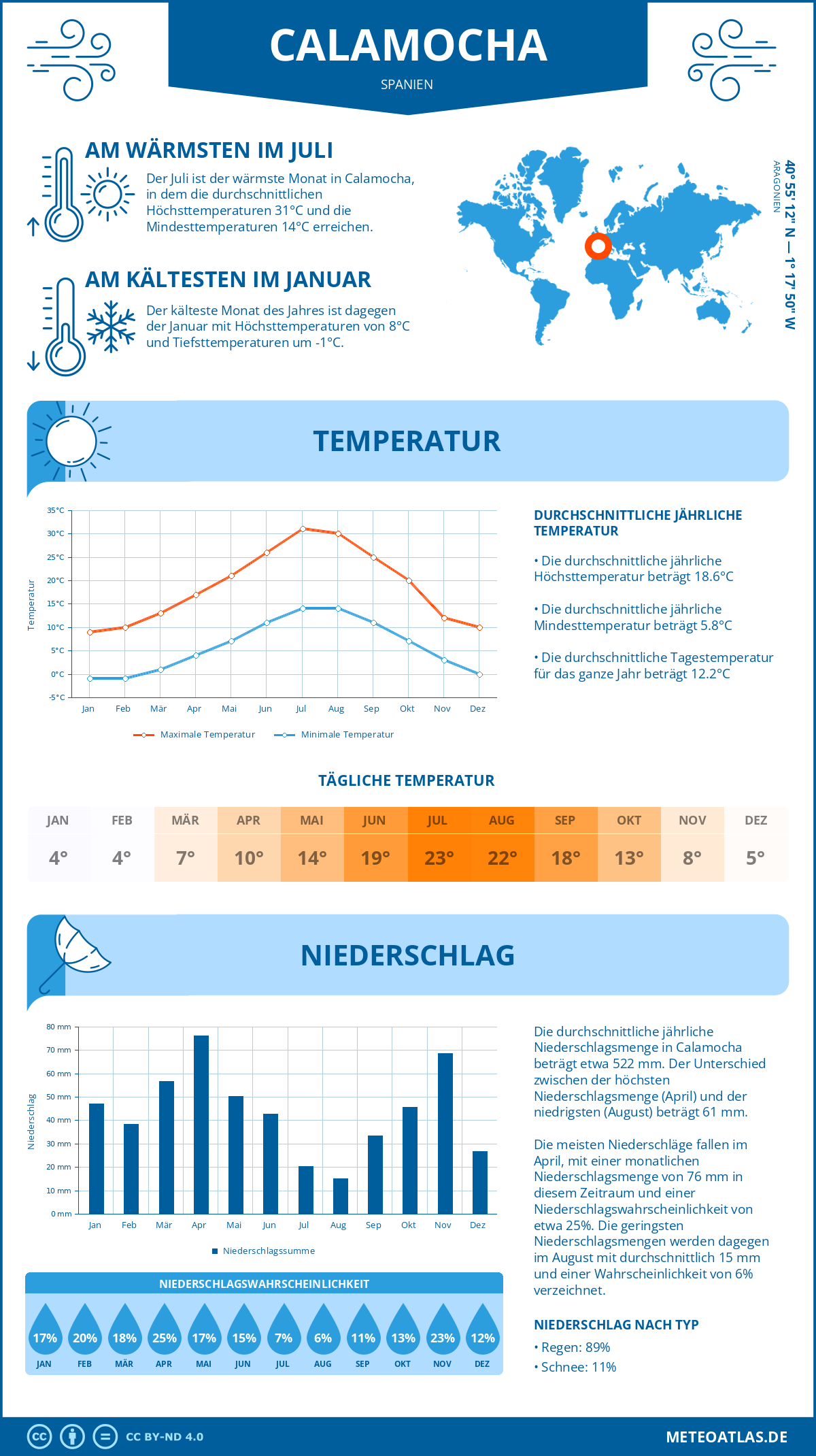 Calamocha weist eine durchschnittliche Tagestemperatur von 19°C im Jahresmittel auf, während die nächtliche Temperatur auf etwa 6°C. Die durchschnittliche Temperatur über den gesamten Tagesverlauf beträgt 12°C.