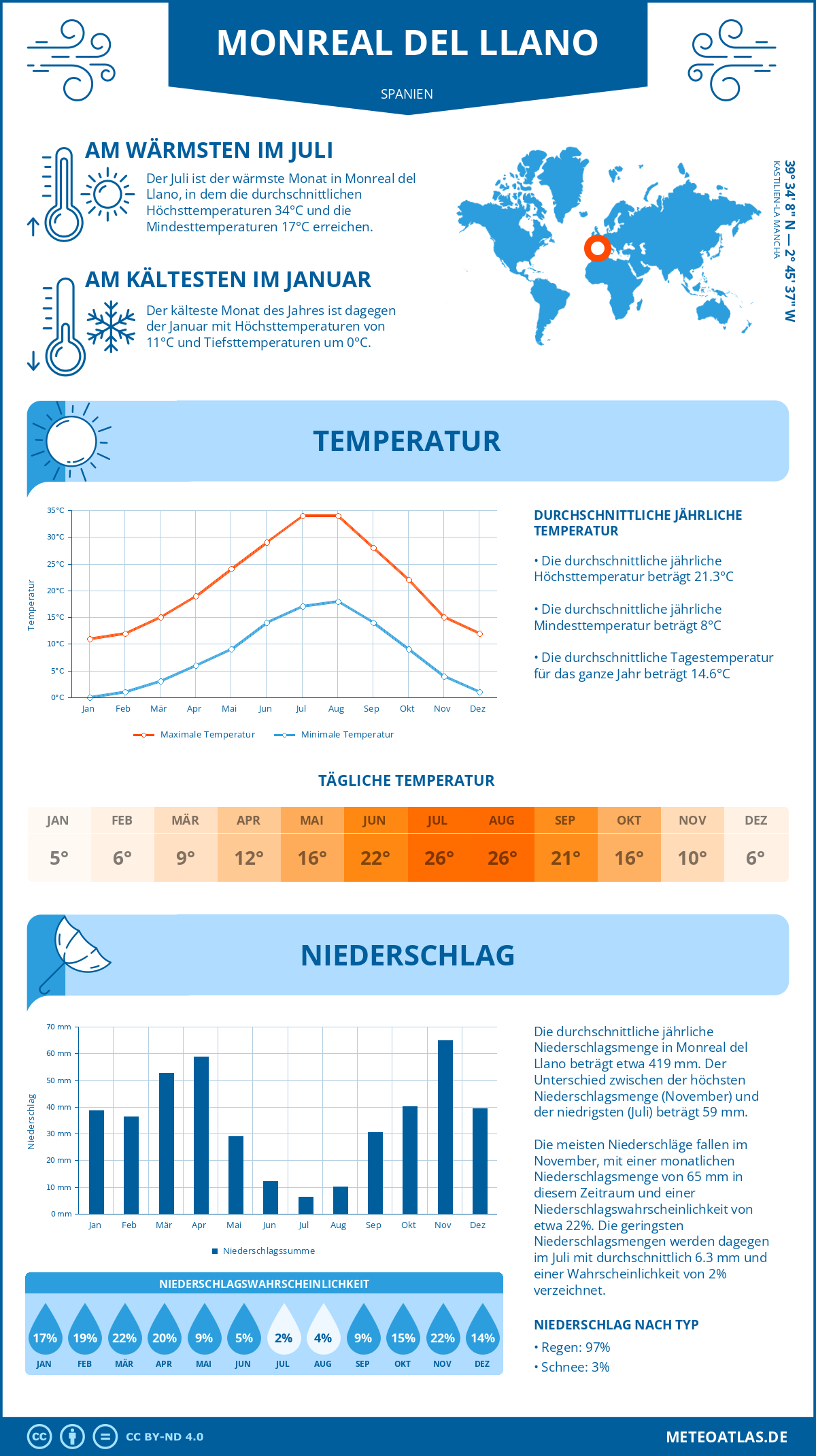 Infografik: Klima sowie monatliche Durchschnittstemperaturen und Niederschläge