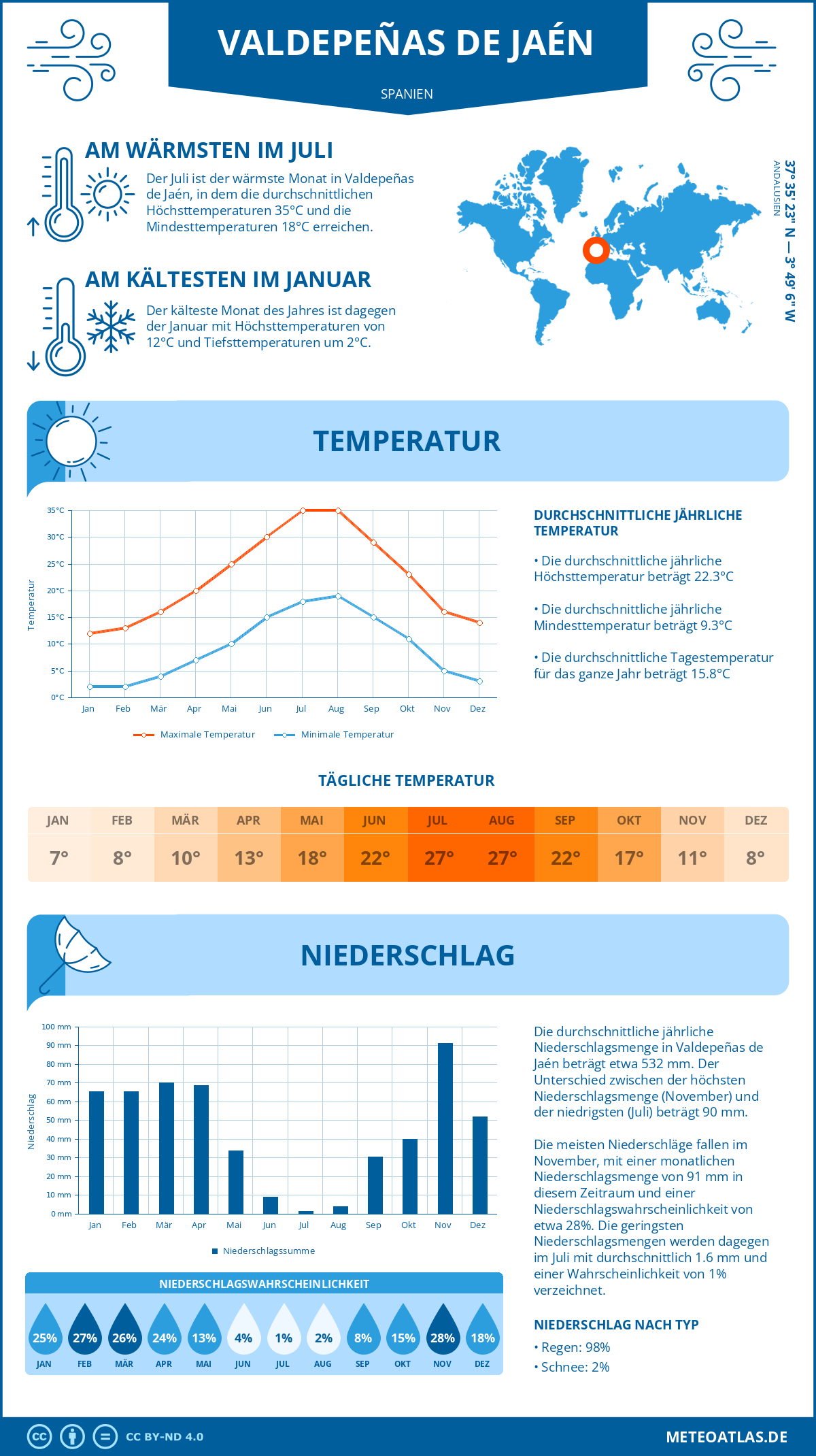 Valdepeñas de Jaén (Spanien) - Wetter und Klima im Jahresverlauf: Durchschnittswerte für Temperatur und Niederschlag