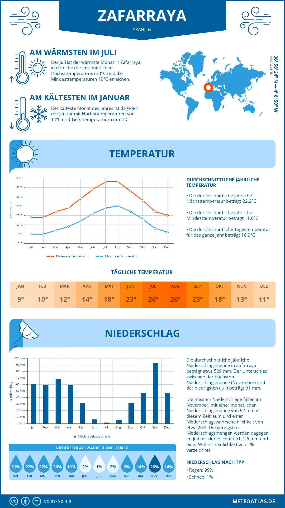 Infografik: Klima sowie monatliche Durchschnittstemperaturen und Niederschläge