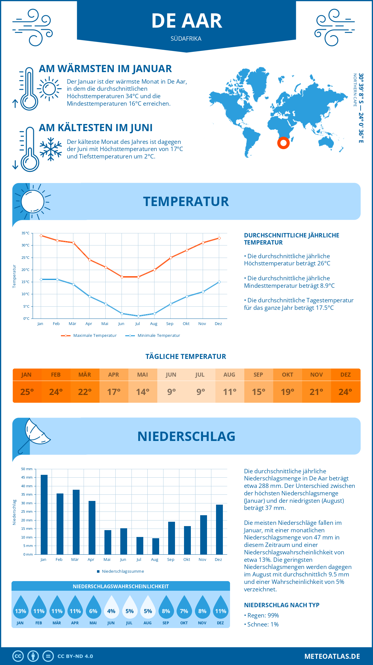De Aar weist eine durchschnittliche Tagestemperatur von 26°C im Jahresmittel auf, während die nächtliche Temperatur auf etwa 9°C. Die durchschnittliche Temperatur über den gesamten Tagesverlauf beträgt 17°C.
