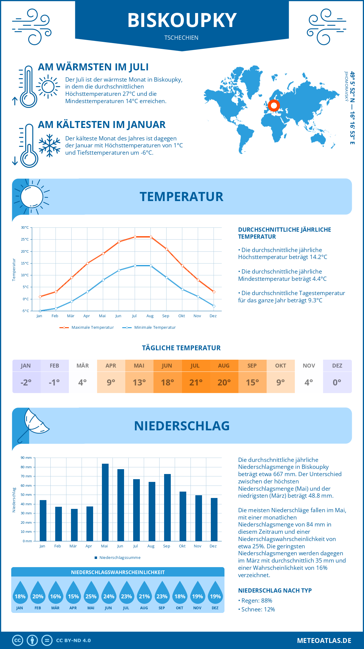 Biskoupky weist eine durchschnittliche Tagestemperatur von 14°C im Jahresmittel auf, während die nächtliche Temperatur auf etwa 4°C. Die durchschnittliche Temperatur über den gesamten Tagesverlauf beträgt 9°C.