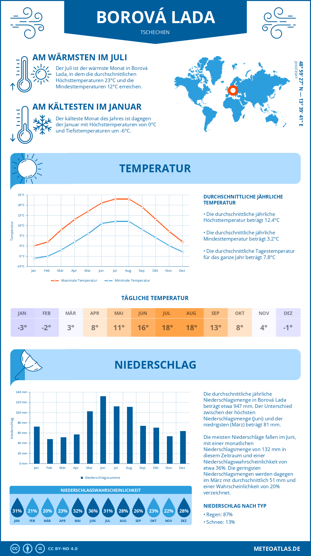 Borová Lada (Tschechien) - Wetter und Klima im Jahresverlauf: Durchschnittswerte für Temperatur und Niederschlag