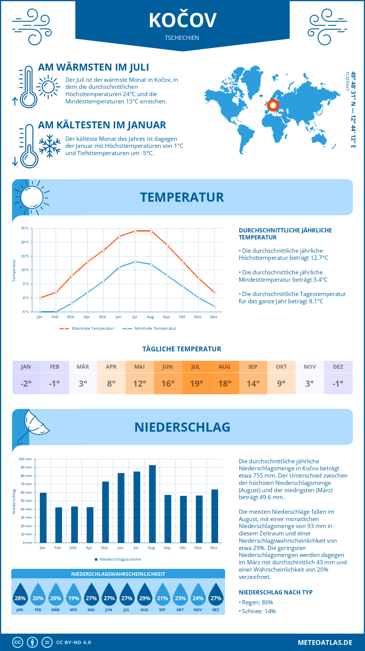 Kočov weist eine durchschnittliche Tagestemperatur von 13°C im Jahresmittel auf, während die nächtliche Temperatur auf etwa 3°C. Die durchschnittliche Temperatur über den gesamten Tagesverlauf beträgt 8°C.