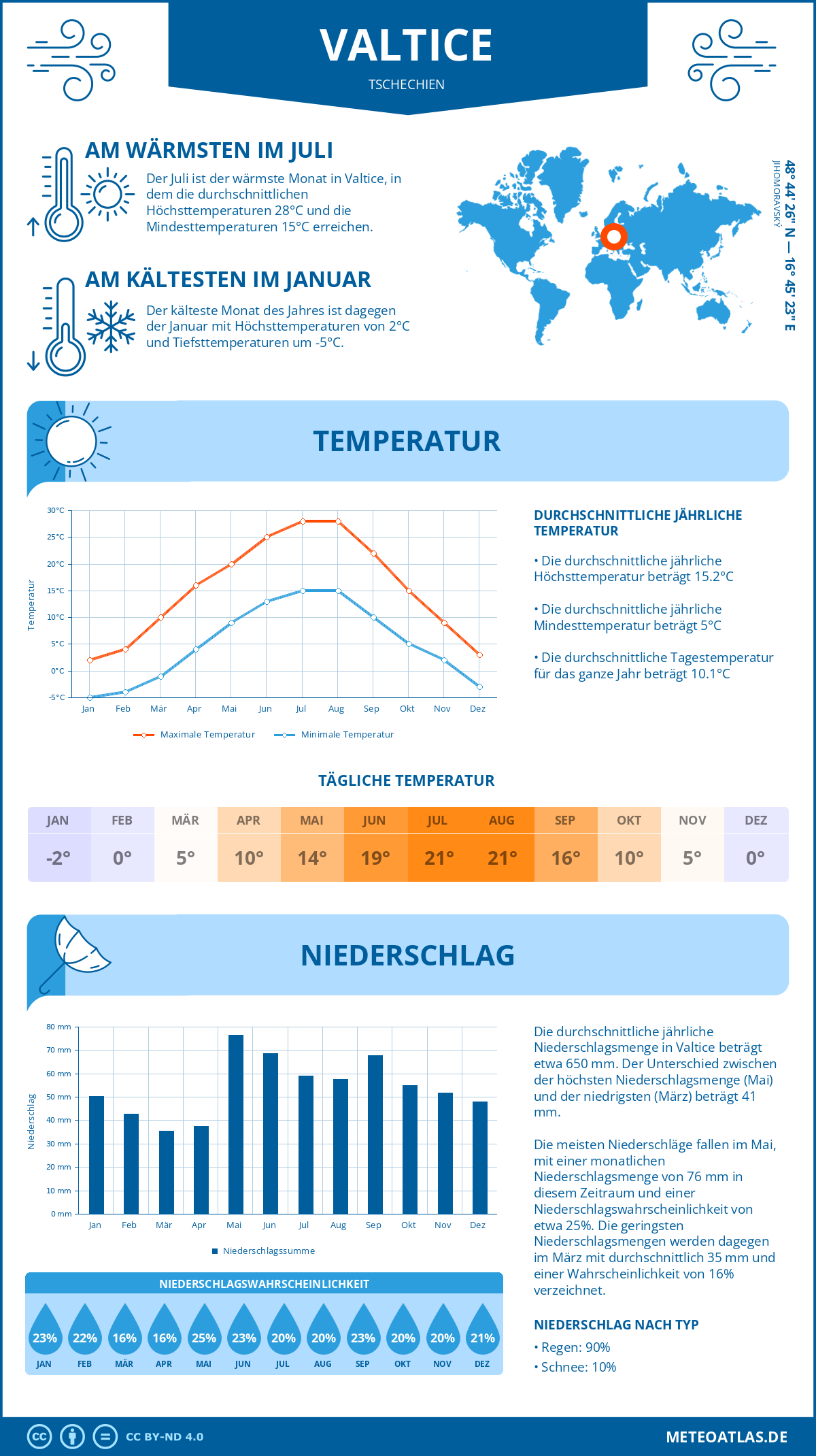 Valtice weist eine durchschnittliche Tagestemperatur von 15°C im Jahresmittel auf, während die nächtliche Temperatur auf etwa 5°C. Die durchschnittliche Temperatur über den gesamten Tagesverlauf beträgt 10°C.
