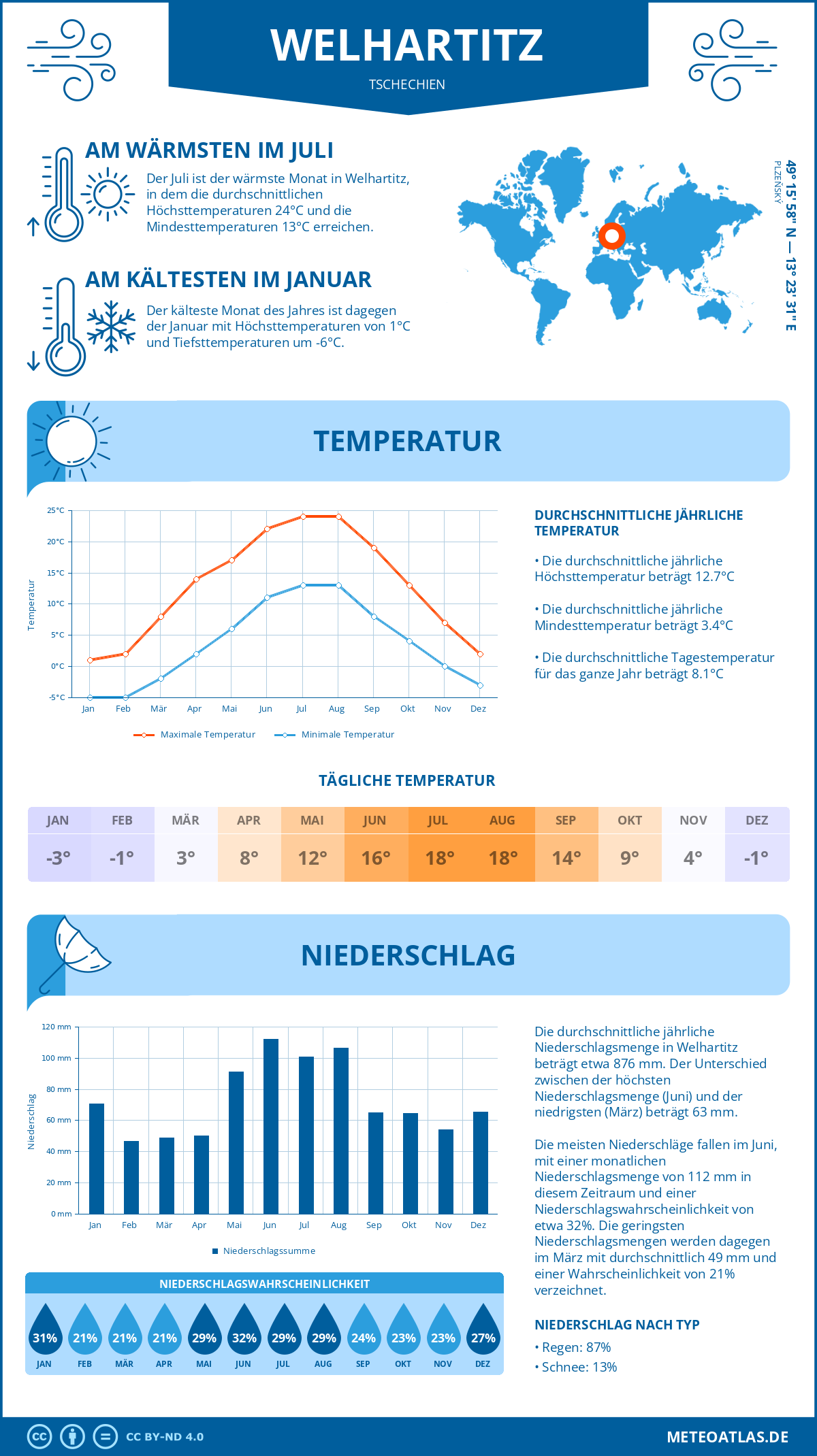 Welhartitz weist eine durchschnittliche Tagestemperatur von 13°C im Jahresmittel auf, während die nächtliche Temperatur auf etwa 3°C. Die durchschnittliche Temperatur über den gesamten Tagesverlauf beträgt 8°C.
