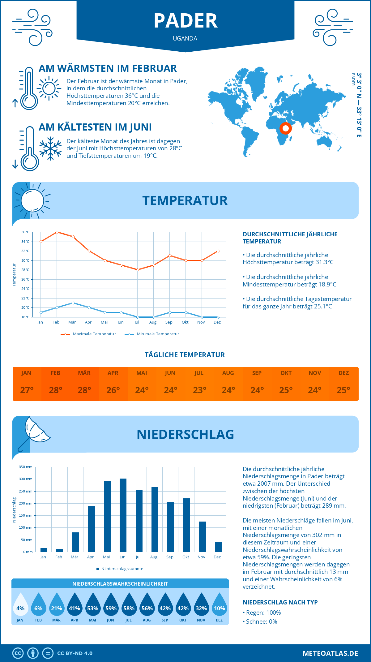 Pader (Uganda) - Wetter und Klima im Jahresverlauf: Durchschnittswerte für Temperatur und Niederschlag