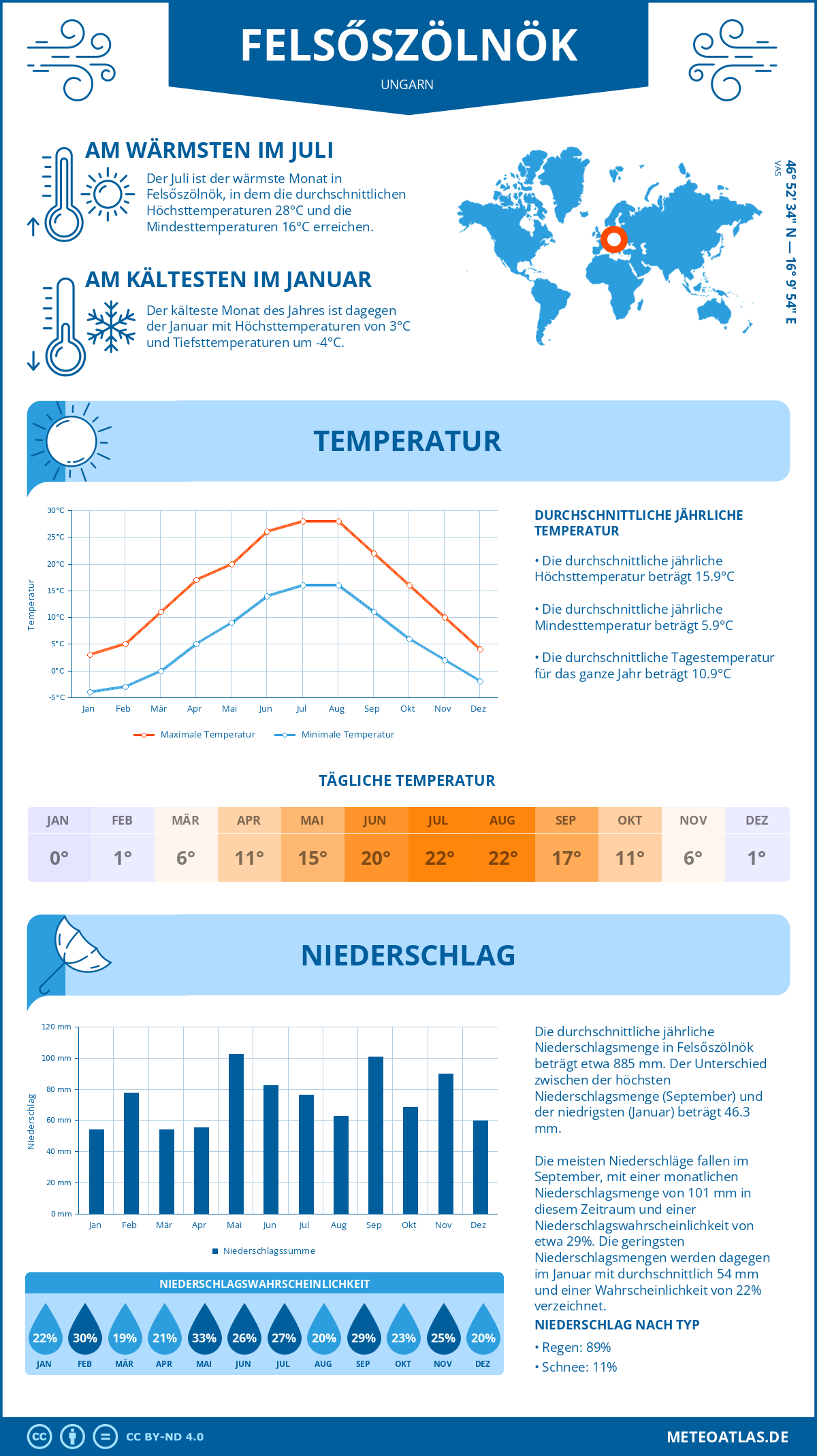 Felsőszölnök weist eine durchschnittliche Tagestemperatur von 16°C im Jahresmittel auf, während die nächtliche Temperatur auf etwa 6°C. Die durchschnittliche Temperatur über den gesamten Tagesverlauf beträgt 11°C.