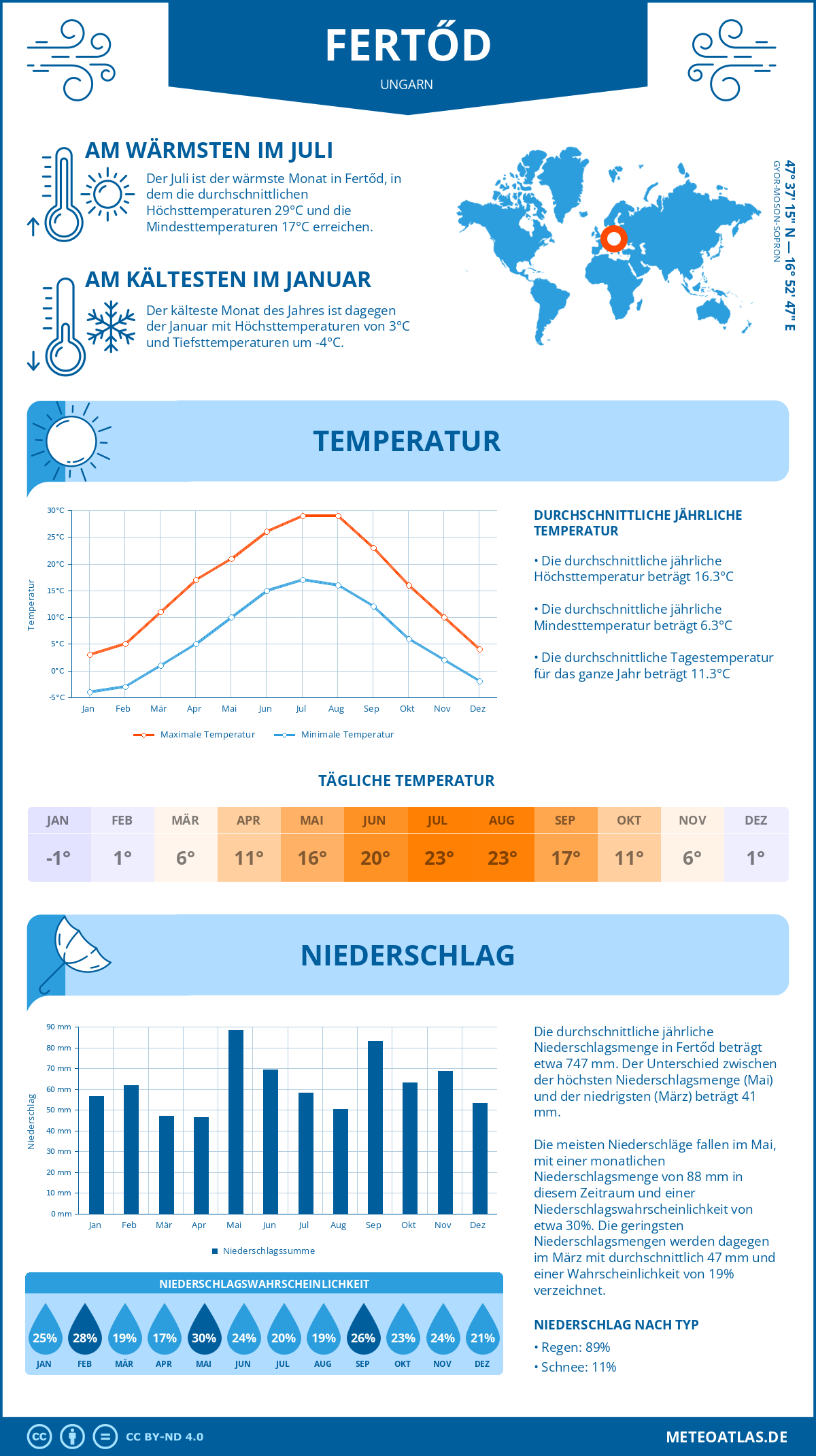 Fertőd weist eine durchschnittliche Tagestemperatur von 16°C im Jahresmittel auf, während die nächtliche Temperatur auf etwa 6°C. Die durchschnittliche Temperatur über den gesamten Tagesverlauf beträgt 11°C.