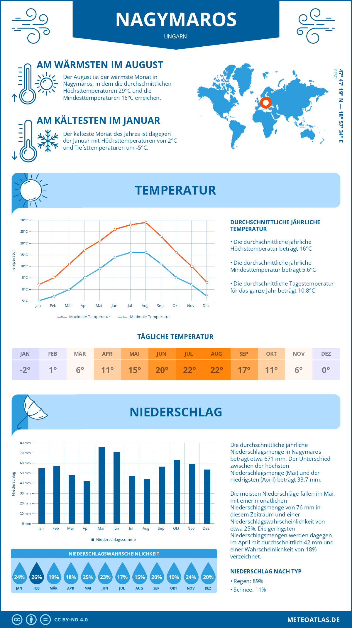 Nagymaros weist eine durchschnittliche Tagestemperatur von 16°C im Jahresmittel auf, während die nächtliche Temperatur auf etwa 6°C. Die durchschnittliche Temperatur über den gesamten Tagesverlauf beträgt 11°C.